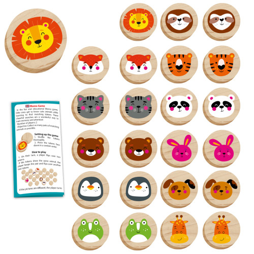In this educational wooden game “Memo”, children get to know cute animals and learn to find matching pieces. The game helps develop memory and attention.