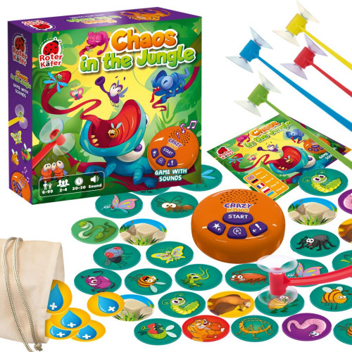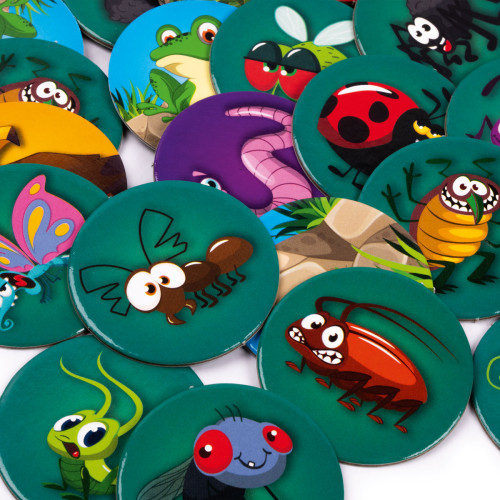 Players compete to catch as many insects as possible. The chips are laid out according to the rules. The sound module is placed in the center. Each player starts their round by