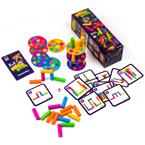 In the box you will find lots of multicoloured cylinders, play pieces, and additional cards with tasks. You will have everything you need to set up a “Mega Boom”!